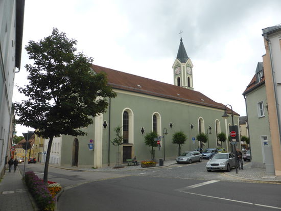 Die heutige Spitalkirche wurde 1514 erbaut, wie es in einer Inschrift am Chor festgehalten ist. In gotischen Minuskeln steht dort: „Als man zalt 1512 jar an sand manjreten abendt ist die gancz stat chamb sambt dem spitl aus gebrunen." Am Chor kann man erkennen, dass das Gotteshaus im gotischen Stil errichtet worden sein muss. So also, wie es hier in der Region im 16. Jahrhundert durchaus noch üblich war. Allerdings hat die Kirche wohl im 18. Jahrhundert ein neues Kirchenschiff bekommen, das andere Stilmerkmale aufzeigt als der Chor. Dieses ist vermutlich etwas breiter als der ursprüngliche Bau und mit einem Flachdach ausgestattet, welches im 16. Jahrhundert nicht üblich war. Die Ursache für den Umbau vermuten Experten in der Brandschatzung Chams durch die Panduren 1742, bei der das gotische Südportal erhatten blieb. Dieses setzt sich aus gestaffelten, graphitenen Spitzbogen zusammen und ist mit 14 ungleich verteilten Kugeln verziert, die vermutlich die heilige Zahl Sieben oder die 14 Nothelfer symbolisieren.