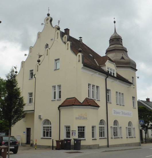 Nicht weit entfernt liegt das Rhaner Braustübl - ein hübscher Bau mit speziel gestaltetem Stufengiebel und achteckiogem Turm.