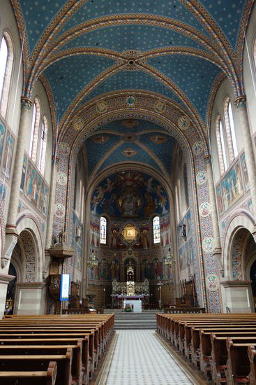 Ein feingearbeitetes Portal mit Vorhalle führt in den 52 Meter langen und 24 Meter breiten Innenraum, der ein mächtiges Hauptschiff mit Tonnengewölbe und zwei niedrige Seitenschiffe umfasst. Die Wände sind von großem Bilderreichtum im Stil der nazarenischen Kunst, einer Richtung, die im 19. Jahrhundert entstand und sich das Mittelalter und die italienischen Maler des 15. und 16. Jahrhunderts zum Vorbild nahm.