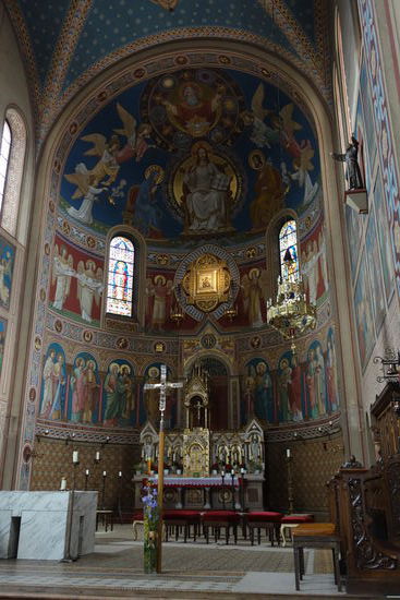 Der Chorraum wird von den Gemälden der Apsis dominiert. Die Zentralfigur ist der thronende Christus - Maria und Josef beten ihn an, darüber sieht man den Heiligen Geist in Gestalt einer Taube. Dieser ist von sieben Feuerflammen, seinen sieben Gaben, umgeben. Wieder darüber ist Gott Vater dargestellt. Er wird von den Symbolen der sechs Schöpfungstage und den zwölf Tierkreiszeichen umrahmt.