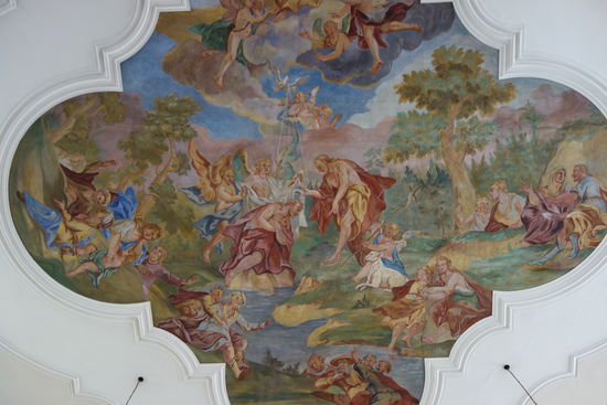 Ein weiteres auffälliges Merkmal der Kirche ist die barock gestaltete Kanzel im Hauptschiff. Sie ist mit einem Holzrelief versehen, auf dem die Predigt Johannes des Täufers dargestellt wird. An der Decke befindet sich die Darstellung der Taufe Jesu am Jordan, ergänzt mit den vier Kardinaltugenden Klugheit Gerechtigkeit, Tapferkeit und Mäßigung. An der rechten Wand hängt außerdem ein großes K