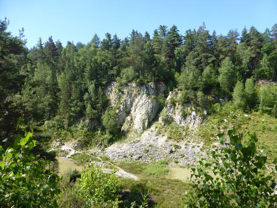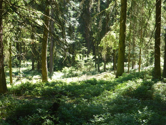 Danach geht es durch lichten Fichten- und Birkenwald mit vielen Waldbeersträuchern an dem alten Steinbruch entlang.