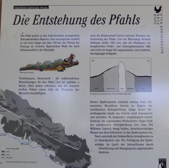 Beim Studium von Reiseführer und Internet fiel uns der Hinweis auf den Pfahl, einen 150 km langen Höhenzug von besonderem geologischen Interesse auf: Im Jahr 2002 wurde der Pfahl vom Bayerischen Umweltministerium mit dem offiziellen Gütesiegel Bayerns schönste Geotope ausgezeichnet. Im Jahr 2006 erfolgte die Aufnahme in die Liste der 100 ausgezeichneten Nationalen Geotope Deutschlands. Das mußten wir natürlich sehen.