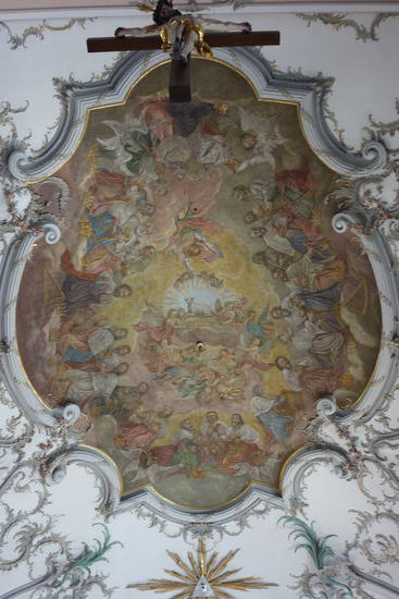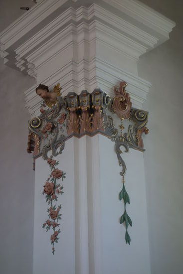 Die Kapelle präsentiert sich im Vergleich zur prunkvollen Pfarrkirche in einer schlichten, barocken Fassung mit gotischen Bauelementen.