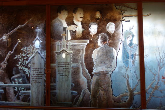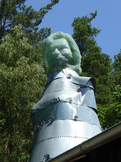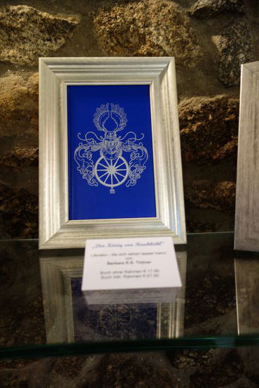 Die Dame an der Kasse ist die Tochter des Künstlers, der die Scheune erbaut und gestaltet hat. Ihre beiden älteren Brüder haben ebenfalls das Kunstgen geerbt. Der älteste pflegt einen Stil, der uns überhaupt nicht zusagt, der zweite hat sehr hübsche Werke im Stil des Realismus geschaffen. Doch die besten Dinge hat die Tochter selbst geschaffen, eine Mischung aus Juwelierin, Goldschmiedin und Sammlerin an Stränden: Schmuck aus Meerglas. Außerdem hat sie mehrere Bücher geschrieben; was für uns neu zum ersten Mal zu sehen ist, ist ein hölzenrer Rahmen, hinter ein ganzes Buch steckt.