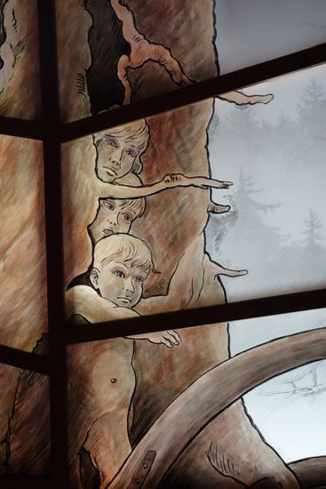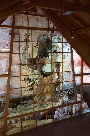 1980 begann der Künstler Rudolf Schmid sen. hier seinen Traum zu verwirklichen und verwandelte mit seiner Familie das Gebäude in ein Gesamtkunstwerk, das in seiner Art einmalig ist! Eine außergewöhnliche Architektur ist der besondere Rahmen für die überdimensionalen Glaswände, die in der Scheune zu sehen sind und mit verschiedenen Geschichten bemalt wurden.