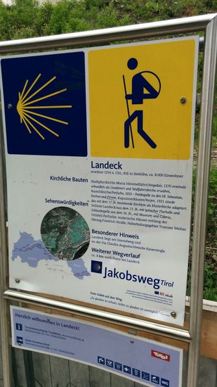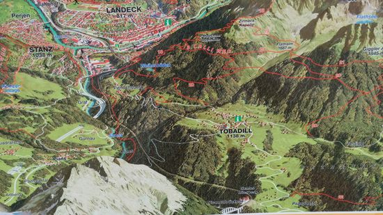 Landeck ist erreicht ! Im Hintergrund die Eisenbahnbrücke. Von rechts kommt die Arlberg-Strecke aus Richtung Innsbruck und verläuft linkerhand in Richtung St.Anton am Arlberg, wo wir im Kapitel "Anreise nach Maloja" den Blick aus dem Lok-Führerstand in den Beginn des Arlberg-Tunnels hatten.
