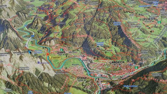 Südlich der Arlbergbahn erscheint der Ort Stams mit dem dazugehörigen Stift Stams, einem Zisterzienserkloster, das 1273 gegründet wurde.