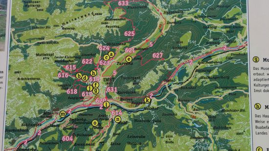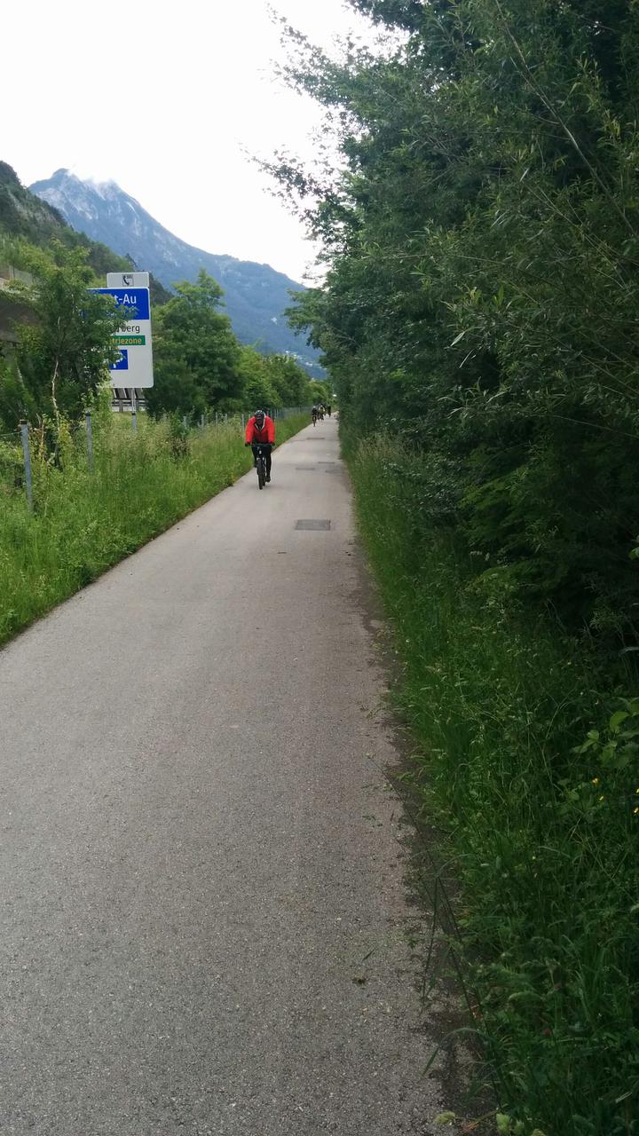 Inzwischen bei Telfs angekommen: 29,3 km bis Innsbruck und lt. Foto-Zeit 16:34 Uhr. Da ich Innsbruck nur am Inn entlang ohne Aufenthalt durchradeln möchte, ist dies eine gute Zeitlage, um noch einige km Fahrstrecke darüberhinaus abzuleisten.