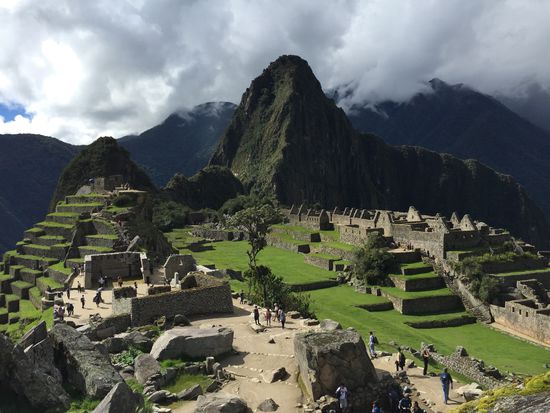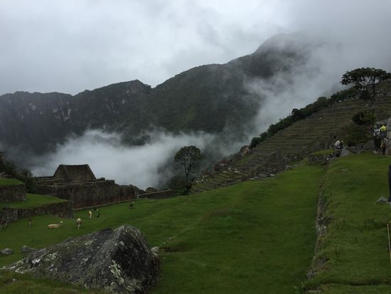 Oben angekommen, reihen wir uns in die Schlange der Menschen ein. Hier herrscht wirklich Gedränge, aber wir können natürlich auch nicht glauben, dass wir die einzigen sind, die den Machu Picchu besuchen möchten. Zunächst können wir noch im Trockenen die ersten Treppen besteigen und die Baukunst der Inka bewundern, es wird jedoch von Minute zu Minute regnerischer, so schlimm, dass Ponchos und Regenjacken unerlässlich geworden sind. Im Nu sieht man überall auf dem Gelände bunte Gartenzwerge, die mit großen Schritten über riesige Pfützen hinweghüpfen.