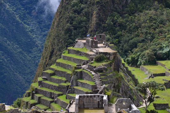 Jürgen bleibt zunächst unten, es ist doch alles ziemlich anstrengend. Aber es hat sich so gelohnt. Daggi und ich gehen ein kleines Stück auf dem Inkatrail um dann am Wärterhaus wirklich unseres Atems beraubt werden. Die Anden liegen vor uns, die Kultstätte malerisch zu ihren Füßen. Man muss fast weinen, so schön ist das. Wir machen ein Foto nach dem nächsten. Eine Etage tiefer treffen wir dann auch Jürgen wieder, der in seinem Tempo dann doch hoch gekommen ist.