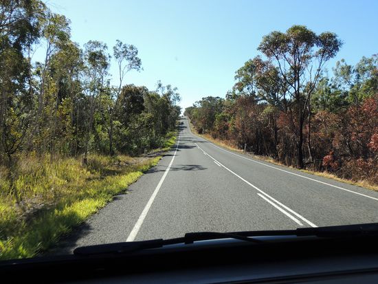 Der Rainbow Beach liegt auf einer Landzunge und wurde nach der farbigen Sandstein Steilküste benannt. Den Highway haben wir schon lange verlassen und fahren durch eine bewaldete Gegend fast alleine. Überall warnen Schilder vor Kängurus und Wombats, aber es lässt sich keiner sehen.