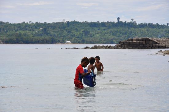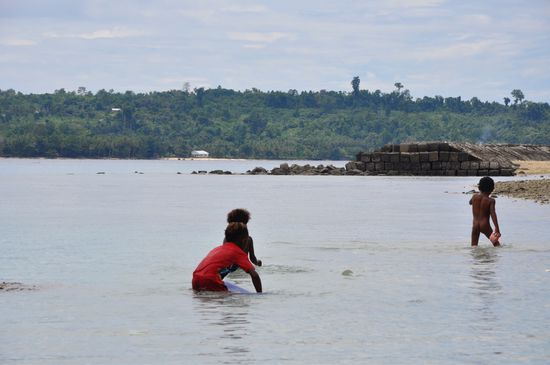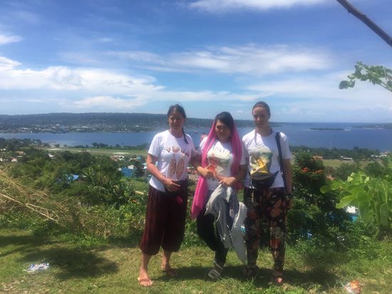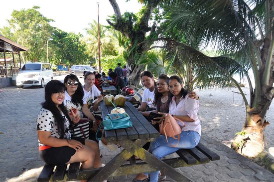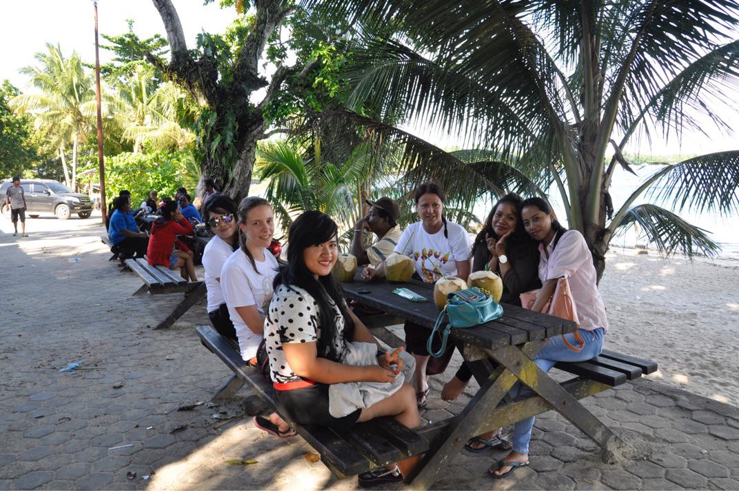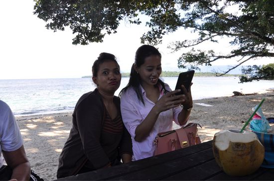 Also, hier in Papua bedeutet zum „Strand gehen“ nicht etwa im Sand liegen und schwimmen—nein—keines der Mädels hat hier Badezeug mit. Wir haben als Einzige Bikinis unter. Die haben schicke kleine Handtäschchen und ständig das Handy in der Hand. Und es wir gegessen was das Zeug hält.