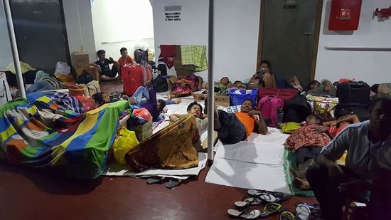 Als wir in Innere gelangen wird mir mulmig--überall sitzen und liegen Menschen. In jedem Gang, sogar auf den Treppen. Einige schlafen, einige essen und rauchen.Viele Familien mit kleinen Kindern, alle auf dünnen weißen Planen oder manche haben sich Matten mitgebracht.