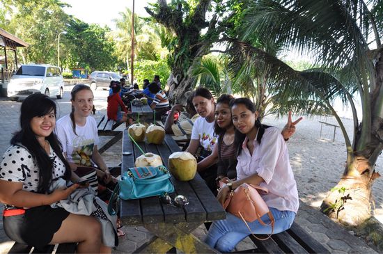 Wir suchen uns einen Tisch und schon sind wir wieder umringt von Schaulustigen—einer ist ganz frech und setzt sich einfach zu uns. Außerdem muss er Thalia dauernd berühren. Das ist ihr unangenehm...da aber die Indonesier nicht unhöflich sind und was sagen, tauscht Kiky ganz geschickt den Platz mit Thalia.