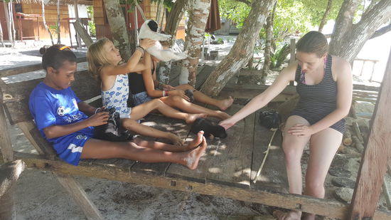 So haben wir heute die Gegend zur rechten und linken Seite erkundet. Wir gehen zu dem benachbarten homestay "Wobei begong Dive Adeventure & Koranu Fyak bungalows". Dort macht Thalia schon mal für morgen für einen „Introducing dive“ Termin.