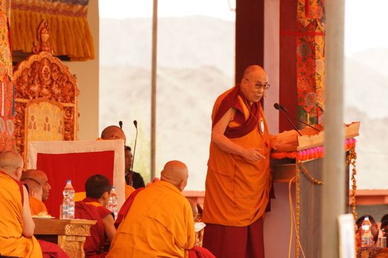 Erst einmal heißt es aber, die Sicherheitskontrollen zu überwinden. Mehrere Tausend Menschen lauschen der Rede des Dalai Lama. Ganz vorne sitzen mehrere 100 Mönche in ihren roten Roben. Seitlich ist Platz für Europäer, die Rede des Dalai Lama wird simultan ins Englische übersetzt. Eine eindrucksvolle Persönlichkeit.