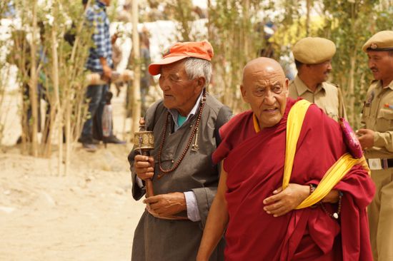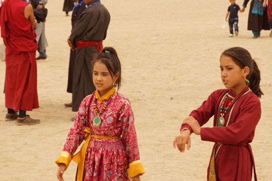 Beim Besuch des Dalai Lama sind viele Ladakhis in ihren traditionellen Trachten unterwegs. Trachten, die wir soeben noch im Museum gesehen haben. Der Halsschmuck der Dame rechts wiegt mehrere Kilogramm.Weitere Fotos vom Besuch des Dalai Lama hier.