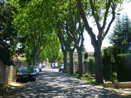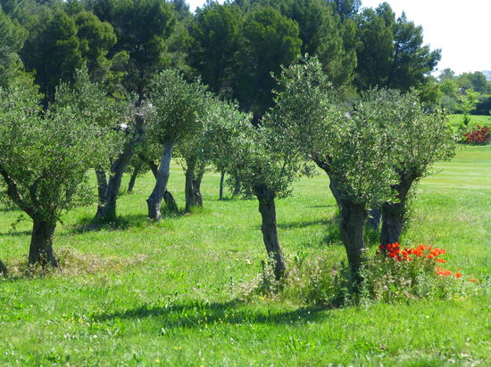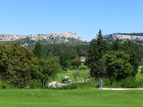Der Mistral bläst unvermindert und sorgt neben einem stahlblauen Himmel für Frösteltemperaturen. Das Sanitärgebäude des Campingplatzes ist mollig warm beheizt und unser Frühstück findet heute wieder indoor statt. Wir entscheiden uns dennoch für eine Wanderung. Jedoch nicht wie ursprünglich geplant über die Höhenzüge der Alpilles. Hier dürfte es nämlich ziemlich zugig sein. Statt dessen greifen wir einen der Vorschläge auf, die an der Rezeption erhältlich sind und starten zu einer 9 Kilometer langen Rundtour direkt ab Mausanne-les-Alpilles. Wir wandern dabei zunächst aus dem Ort hinaus und in Richtung Golfplatz. Diesen dürfen wir auf einem offiziellen Weg auch durchqueren und können dabei den Golfern ein wenig über die Schulter schauen.