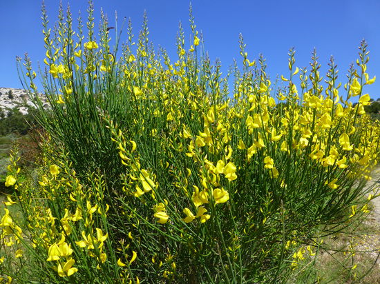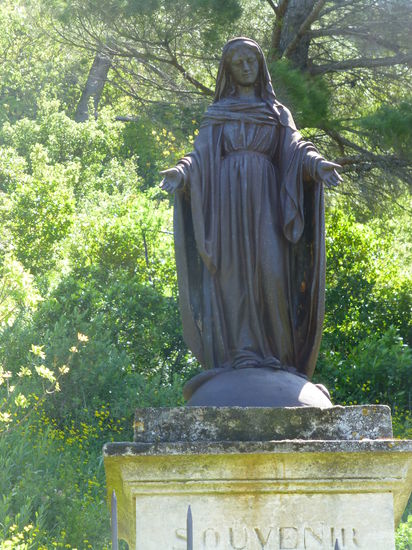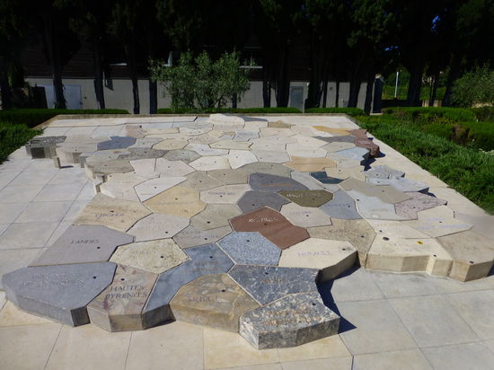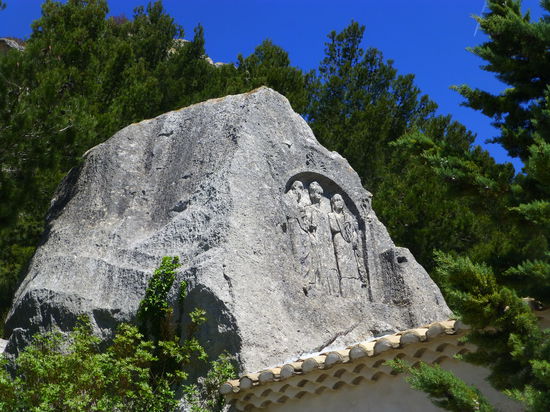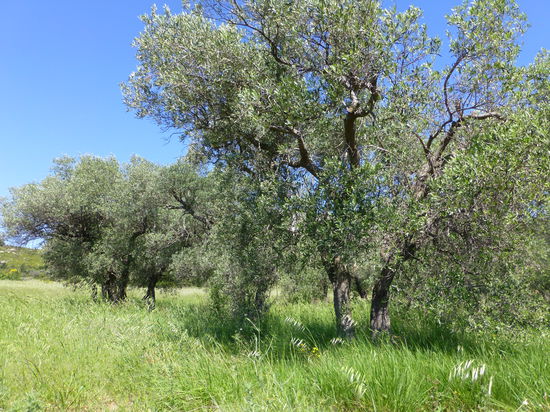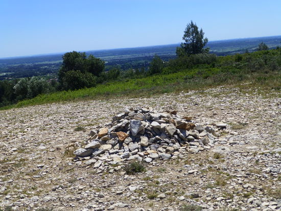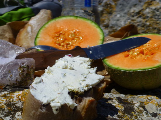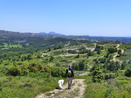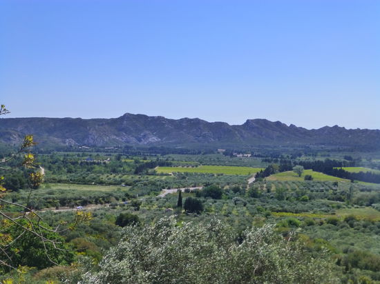 Vorbei an Olivenhainen und Weinbergen erreichen wir die Zufahrtsstraße nach Le-Baux-en-Provence. Hier ist heute am Pfingstsonntag der sprichwörtliche Teufel los. Besuchermassen pilgern hinauf und wir sind froh, dass wir die Straße hier nur kurz streifen. Wir biegen wieder auf einen Wanderweg ab und umrunden das Bergmassiv etwas unterhalb der Burgruine. Kaum haben wir die Straße ein paar Meter hinter uns gelassen, ist es wieder wunderbar ruhig und wir begegnen nur vereinzelten Wanderern. Auf einem Fels-Vorsprung gibt es schließlich ein Panorama-Picknick par Excellence.