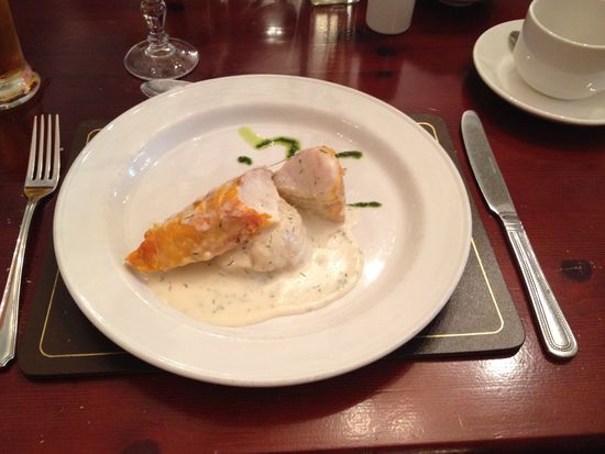 Das Abendessen überrascht wieder mit einem Auswahlmenüs: Tunfischsalat oder Kartoffel-Lauchsuppe; Schweinebraten oder Hake (hier fälschlicherweise als Kabeljau deklariert) und Profiteroles oder Sherry-Trifle.