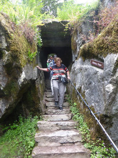 Zwei Kreuzfahrtschiffe sind in Cork angekommen und ‚karren‘ z.Zt. ihre Passagiere durch die Gegend. Die Amerikaner wollen Gottseidank alle den in eine Zinne eingelassenen bla-bla-Stein küssen und stehen in langer Schlange vor dem Eingang des Turmes. Es heißt, wer den Blarney Stone küsst, dem werde die Gabe der Beredsamkeit verliehen. Dazu legt man sich mithilfe eines Wärters auf den Rücken, biegt den Oberkörper über dem (vergitterten) Abgrund abwärts und versucht die Unterseite des Blarney-Steines mit den Lippen zu berühren.