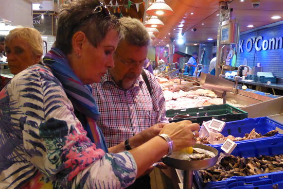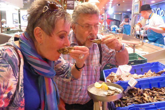 Dafür finden wir am seafood-Stand Austern, die wir natürlich probieren müssen. Die arme Chr. zuschauen, wer ißt auch schon kein Meeresgetier - darf aber fotografieren – nämlich uns beide beim Schlürfen.
