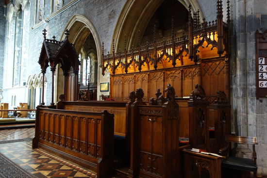 Das Chorgestühl wurde 1901 installiert. Es ist aus Donaueiche gefertigt. Als Vorbild diente das Chorgestühl der Kathedrale von Brügge (Belgien), das aus dem Jahr 1470 stammt. Die Figuren symbolisieren die vier Evangelisten: Johannes - Adler, Markus - Löwe, Lukas - Stier und Matthäus - Engel. Die Platten auf der Vorderseite zeigen verschiedene Szenen aus der irischen Geschichte.