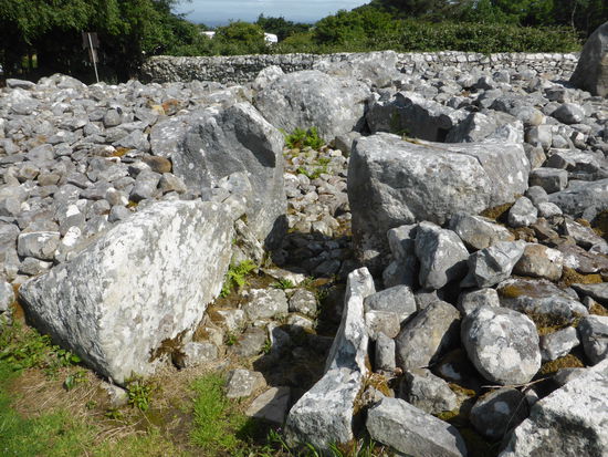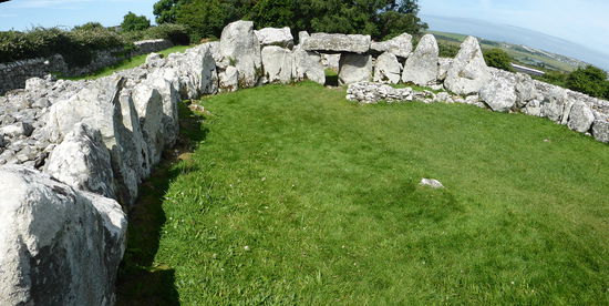 Ein keilförmiger Steinwall umschließt einen offenen Hof, hinter dem sich eine zweigeteilte Grabkammer befindet, dahinter zwei weitere und Reste einer dritten. Die Anlage ist mindestens 4500 Jahre alt.