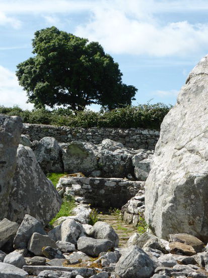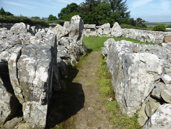 der Zugang zu dem vom Hügel umfassten Vorhof erfolgte über einen schmalen, möglicherweise einst sogar überdachten kurzen Gang. Er liegt an der östlichen Seite und führt durch den 4,5 Meter langen Zwischenraum, der von Orthostaten gebildet wird, in den Hof.