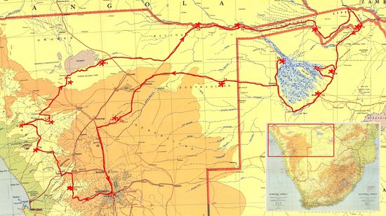 Von Windhoek aus gen Westen und dann am Erongo-Gebirge vorbei ins Damaraland, weiter durch den Etosha-NP, den Caprivi-Streifen, den Chobe-Park und am Okavango-Delta vorbei zurück nach Namibia. Letzte Station: Waterberg.