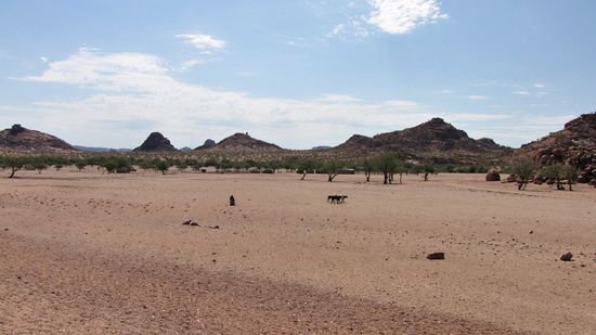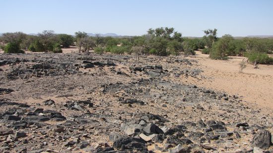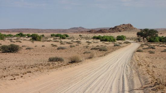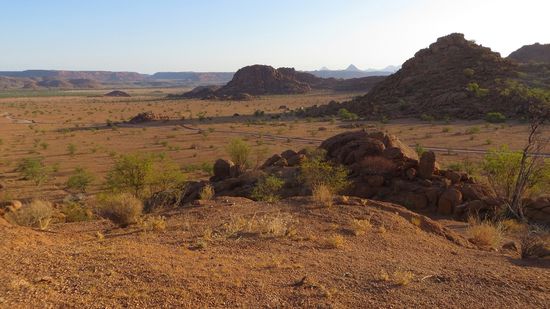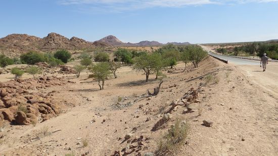 Nach der etwas ewenig abwechslungsreichen Strecke Richtung Khorixas wird es erst zum Trockenbett des Huab hin wieder interessanter und bergiger. Nur im Bereich der Brücke über das Ugab-Tal ist die Landschaft interessant.