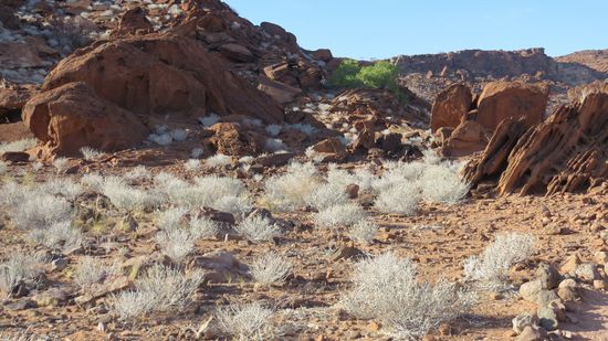 Ein Highlight des frühen Morgens war zweifellos der Abstecher am Brandberg vorbei zur White Lady Lodge. Bis dort hin ging es durch die Savanne mit hohem Gras, vorbei an Granitfelsformationen und mit Blick auf den Brandberg, der wie ein Tafelberg aus der Ebene ragt. Hinter der Lodge dann weiter auf einer schmalen Sandpiste – und wir befinden uns fast im „Wohnzimmer“ der Wüstenelefanten. Viel Grün, frisch belaubte Sträucher, das trockene Flussbett des Ugab und – die Hinterlassenschaften der Bewohner. Nur die Elefanten selbst sind nicht zu sehen.