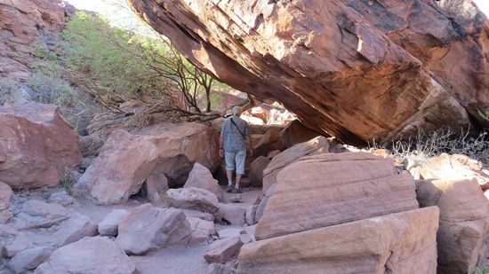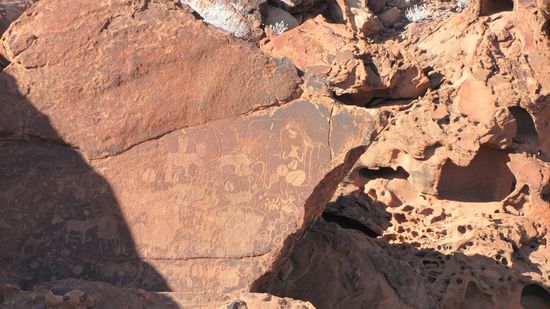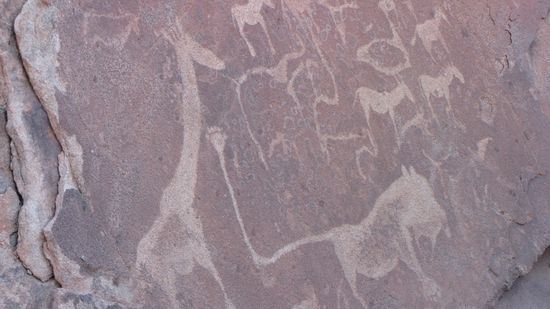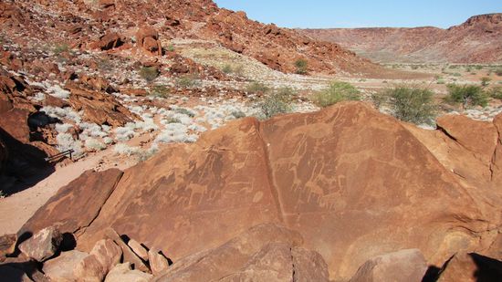 Statt der geplanten 45 Min benötigen wir fast ½ Std. länger, um alles zu sehen. Das Gros der Gravuren soll um die 6.000 Jahre alt sein, wobei es auch wesentlich ältere und jüngere gibt. Es werden Spezies aus der Umgebung gezeigt aber auch Robben, Pinguine und Flamingos (als Darstellung für die zuhause gebliebenen, was auf Wanderungen – z.B. Salz von der Küste holen – erlebt und gesehen wurde). Auch ‚Landkarten‘ mit Markierungen von Wasserlöchern, Trance-Bilder der Schamanen etc. sind zu sehen