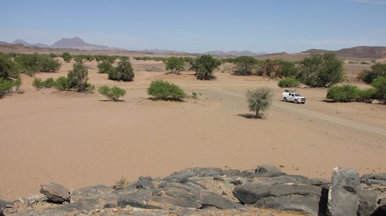 Auf der anschließenden Tour im Bereich des Abu Huab sehen wir viel Landschaft, leider keine der hier lebenden Tiere (Rhinos, Antilopen, Elefanten, Strauße, Warzenschweine) – es ist fast Mittagszeit, da ziehen sich alle zurück in den Schatten.