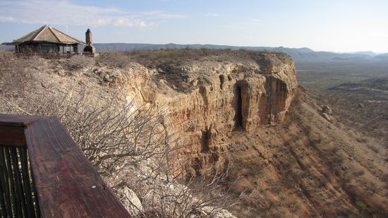 13h Ankunft Vingerklip Lodge. -> 160km. Kleine Häuschen mit Strohdächern liegen verteilt am Hang. Alle mit Blick auf den kleinen Tafelberg und das Wasserloch. Sehr ansprechend eingerichtet.