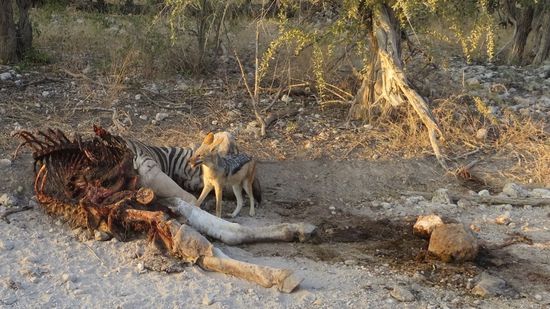 Sicherlich ein seltener Anblick war die Vorderhälfte eines Zebras am Pistenrand, an dem sich ein Schakal gütlich tat. Eine Hyäne wartete schon in einiger Entfernung, fühlte sich aber von uns gestört.