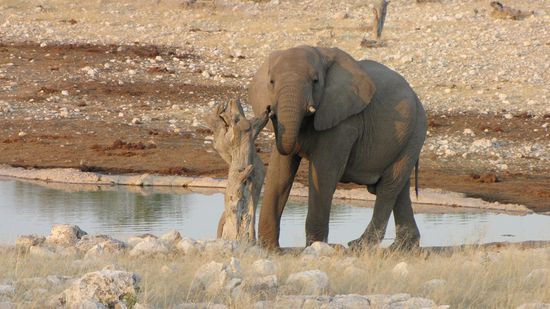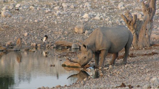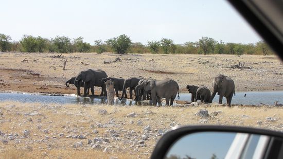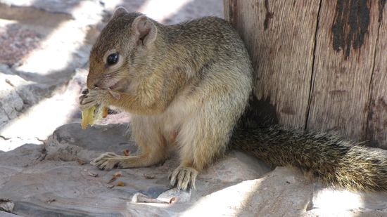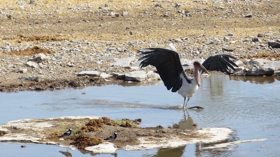 Bei unserer Mittagspause am Wasserloch in Halali sehen wir 2 Elefanten, einige Impalas und einen Marabu, der sich erst vorsichtig nähert und dann im Wasser landet. Und direkt neben uns ein Hörnchen, das das abgelegte Apfel-Kerngehäuse klaut...