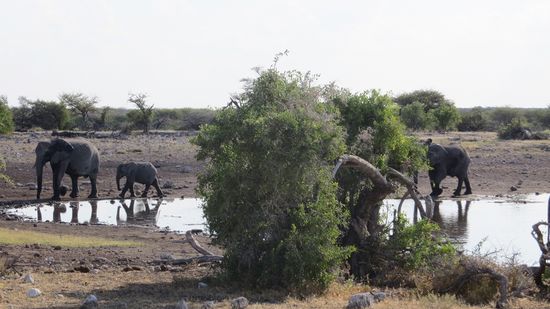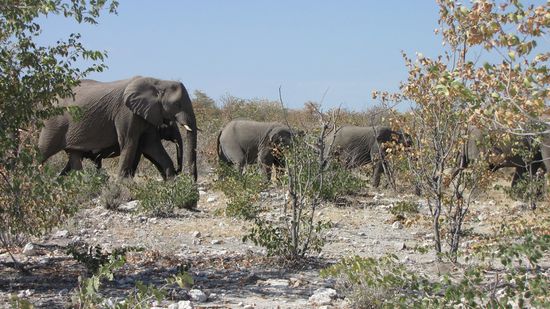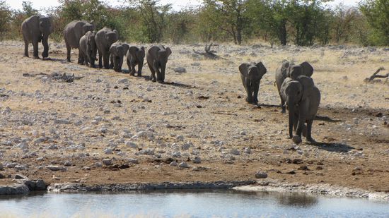 Wieder tummeln sich etliche Tiere am Olifantsbad: Springböcke, Impalas, Elenantilopen, Zebras, eine Gruppe aufgeregter Strauße, Kudus und einige Vögel. Eine Gruppe kommt nach der anderen zum Wasserloch. Es sind sicher weit über 100 Tiere. Kaum eines, das sich länger aufhält. Ist der Durst gelöscht, verschwindet die Gruppe wieder. Wir fahren weiter und sehen nach 300m im Gebüsch eine Elefantenherde (10 Tiere), die Richtung Wasserloch marschiert. Also – zurück! Angekommen erscheint die Gruppe gerade zwischen den Büschen und erobert das Nass. Glück gehabt!