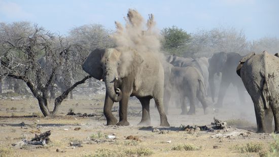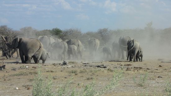 Weiter geht es Richtung des östlichen Tores nach Namutoni. Unterwegs viel Gegend, mal Herden von Springböcken, einige Gnus und Strauße. Am letzten Wasserloch verlässt gerade eine Herde Elefanten das Nass und bewegt sich Richtung Piste. Jenseits wird dann ein ausgiebiges Staubbad genommen. Ein tolles Bild!
