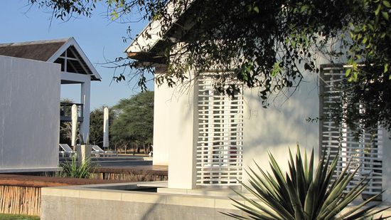 Die Bilder dieser stylischen Lodge sprechen für sich. Das Abendessen (Carpacio vom Rind, Biltong-Suppe, Sorbet, Steak/Cordon bleu, Kuchen) wurde im Kerzenschein am Pool serviert. Der Service war sehr gut.