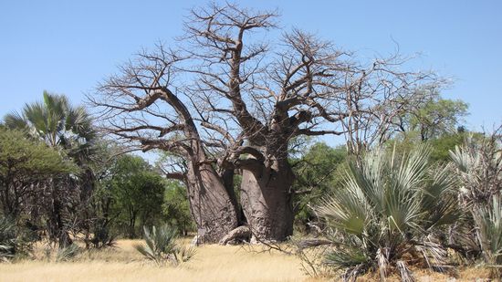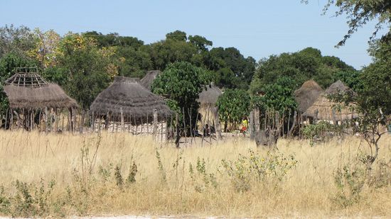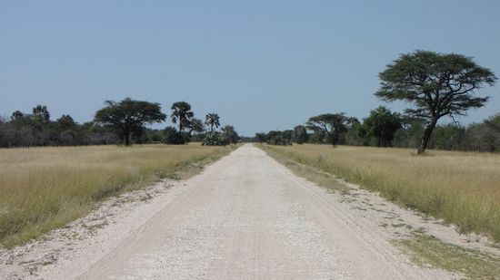 Auf schier endlos scheinender Piste geht es nach Osten auf einer Querverbindung Richtung B8. Auf 140 km begegnen uns 2 Autos. Am Big Baobab Tree (südl. der D3016) machen wir eine kurze Pause und legen einen Spaziergang zum Baum ein. Nach weiteren 60 km erreichen wir die geteerte B8. Rechts und links der Straße liegen immer wieder Ansammlungen von kleinen, srohgedeckten Hütten. Alles scheint sehr sauber zu sein. Am Straßenrand stapelt sich Verkaufsware wie fein gebündeltes Brennholz, Kürbisse, Holzfiguren und –spielzeug etc.