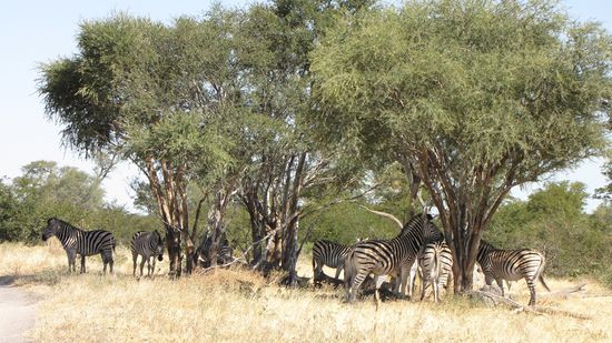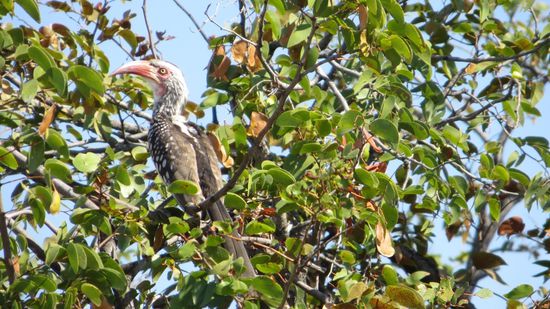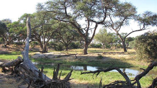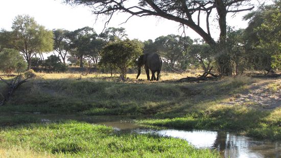Unser Stellplatz ist riesig, unter alten Akazien voller reifer Schoten. Vorsichtshalber parken wir das Auto nicht unter einem Baum, sondern in einer Baumlücke nahe an Dusche und WC. Schon bald bekommen wir Besuch von einem dieser großen grauen Dickhäuter. Es soll nicht der letzte bleiben. Zwischen 16h und 18h herrscht reger Verkehr, den wir staunend und respektvoll bewundern. Der Kwhai ist hier nur wenige Meter breit und bietet viel Grün für Elefanten und Antilopen.