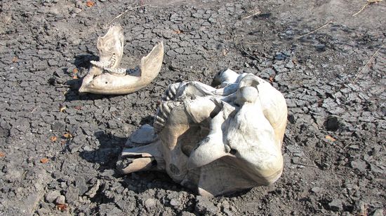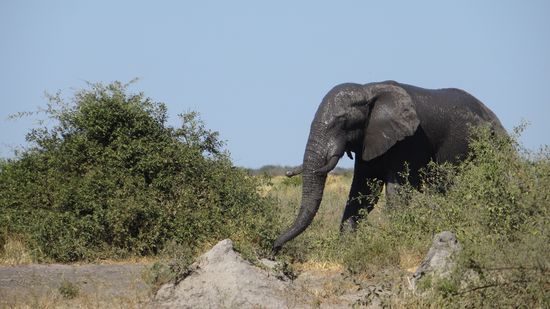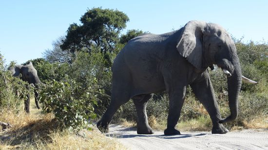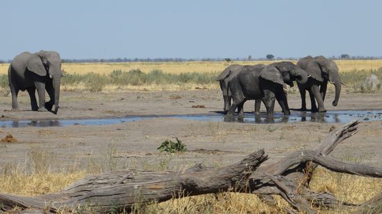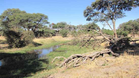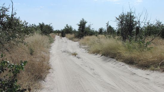 Hinter Kachikau wird der Reifendruck gemindert, da die Piste tiefsandig, ausgefahren und wellig ist. Wir folgen dem empfohlenen Umweg, dem man bis zur Cutline Road des Chobe Forest Reserve und zum Gocha Gate folgt. Tiefe Sandpassagen, km-lange Achterbahn, teilweise harte Pisten – alles wird geboten. Weiter nach Savuti durch dichten Baum- und Strauchbestand, der sich hinter Savuti-Bridge lichtet. Die Sandridge-Road nach Mababe ist recht mühsam, von der alternativen Marsh Road wird z. Zt. abgeraten. 21 km vor Mababe treffen beide „Straßen“ aufeinander. Weite, leuchtend gelbe Grasflächen. Gegen Ende der Fahrt überraschen uns nochmals Tiere mit ihrer unerwarteten Präsenz: einige Elefanten, Büffel und diverse Antilopen und Kudus.