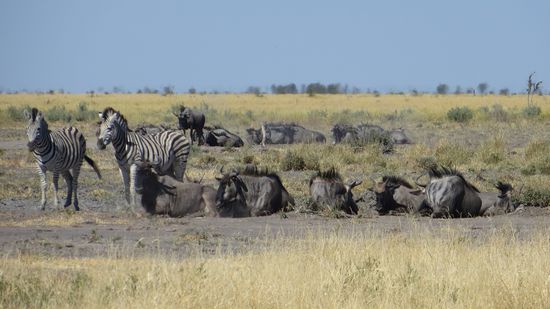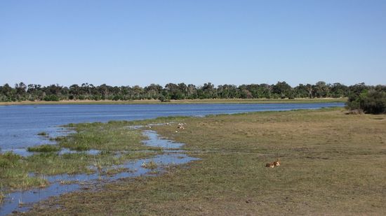 8 h - Abfahrt in das Moremi Game Reserve. Auf der Zufahrt zu unserem Camp (6km zur Strasse) äsen zu dieser Zeit viele scheue Gnus und Impalas.