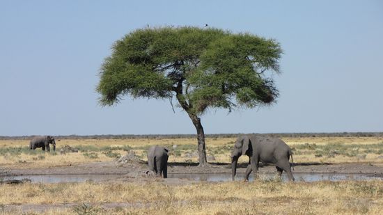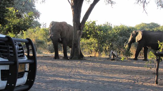 Beim Blick aus der Dusche kommt uns schon der erste Elefant entgegen. Sobald er sich getrollt hat, beginnen wir mit dem Frühstück, das unvermittelt unterbrochen wird. Wieder nähern sich 3 Elefanten. Schnell tragen wir den gedeckten Frühstückstisch außer Sicht- und Riechweite hinter das Auto. Wir frühstücken im Stehen. Die Elefanten rütteln an den Ästen und verspeisen die Schoten. Im Grün äsen die Antilopen. Unglaublich!