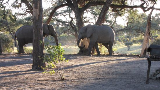 17.20h Schon wieder bewegen sich zwei Dickhäuter über unseren Platz. Man hört keinen Ton. Kein Stampfen, kein Schnauben. Unvermittelt sind sie da und ziemlich nah . „Die tun nichts“, sagt mein Göttergatte.....