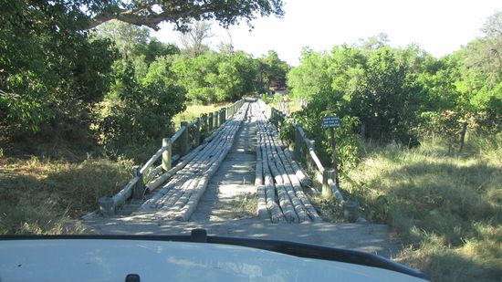 Wir erreichen nach 1 Stunde Fahrzeit und 40 km das Nordgate über die aus Stämmen gebaute Khwai Bridge.
