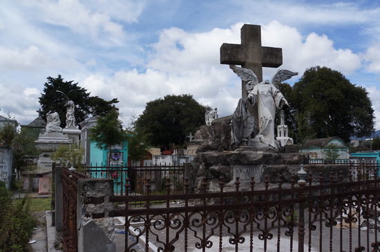 Xela liegt auf über 2234 Metern in den Bergen, es ist daher relativ frisch. Interessant ist der großen Friedhof. Man sollte allerdings zu Zeiten hingehen, wenn auch viele andere da sind. Da sich Diebe gerne hinter den Gräbern verstecken und einen dann überfallen. Aber wenn man zu betriebsamen Zeiten geht und auf dem Hauptweg bleibt, ist es sicher. Den meisten Statuen fehlt Kopf. Diese werden von Grabräubern nachts abgeschlagen und dann verkauft. Einige werden jedoch nicht angerührt, da sie jeden verfluchen, der sie zerstört.
