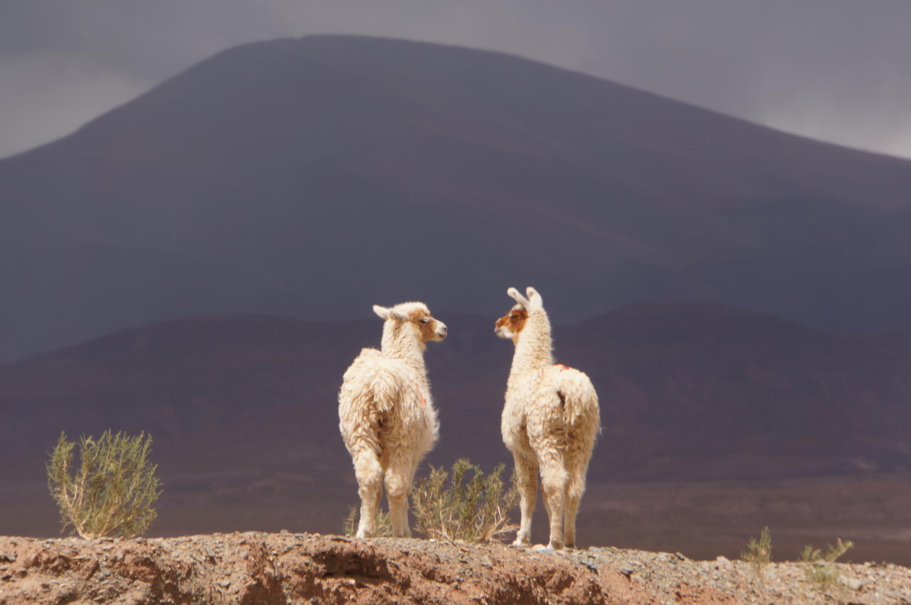 Nächster Stopp war noch ein Stück weiter nördlich die Salinas Grande, eine Salzwüste, jedoch nicht ganz so spektakulär wie die Salar de Uyuni in Bolivien. Als wir dort ankamen war der Himmel mittlerweile ziemlich wolkenverhangen und einige davon gefährlich dunkel. Man kann nicht direkt an der Salina anhalten, sondern muss ein Stück durch eine Sandlandschaft hinlaufen.
